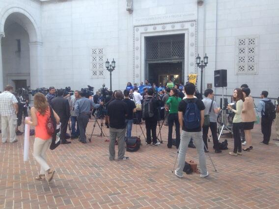More journalists than activists turned out for the start of a rally for immigration reform on the steps of Los Angeles City Hall Tuesday morning staged by labor unions and pro-amnesty organizations. The event was aimed at warning Republicans in the House of Representatives to pass an immigration bill that includes a "path to citizenship" for illegal aliens or face the wrath of Hispanic and progressive voters in their districts.